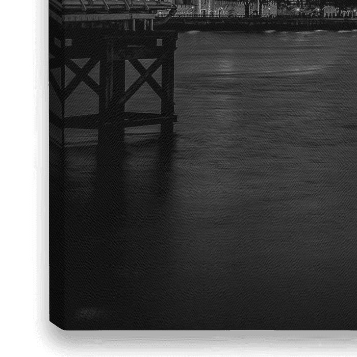 Schwarz-Weiß: Am frühen Morgen ist die Sonne noch nicht aufgegangen. Die Beleuchtung entlang der Themse-Promenade beleuchtet die Straße mit einer schön beleuchteten Tower Bridge in der Ferne.