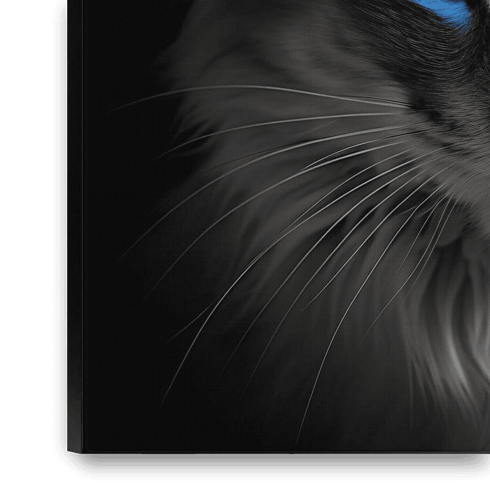 Bestelle das digitale Kunst Bild Schwarz-weiße Katze mit leuchtenden blauen Augen von YArt als Reproduktion auf Leinwand, Alu-Dibond, als Poster, Fototapete oder Acrylglasbild.