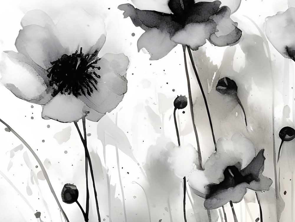 Manchmal fühlt sich das Leben nicht so bunt an. Zeichnung von mehreren Mohnblumen, die mit Aquarellfarben in Schwarz und Weiß gestaltet wurde