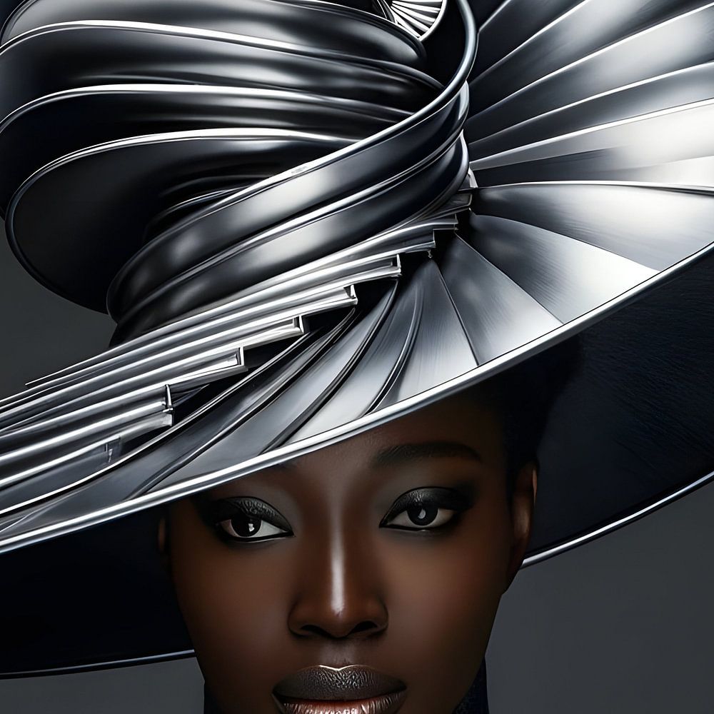 Das Kunstwerk zeigt das Porträt einer schwarzen Frau, die einen auffälligen Hut trägt. Der Hut ist aus glänzendem Metall gefertigt und hat eine komplexe, verdrehte Struktur, die ihn wie ein futuristisches Design aussehen lässt. Die klaren, symmetrischen Linien und die glänzende Oberfläche verleihen dem Hut einen industriellen und modernen Charakter.