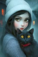 Ein junges Mädchen mit schwarzem Haar und Mütze hält eine schwarze Katze mit auffallend gelben Augen im Arm. Sie stehen vor einem stimmungsvollen Hintergrund mit leuchtenden Fenstern.
