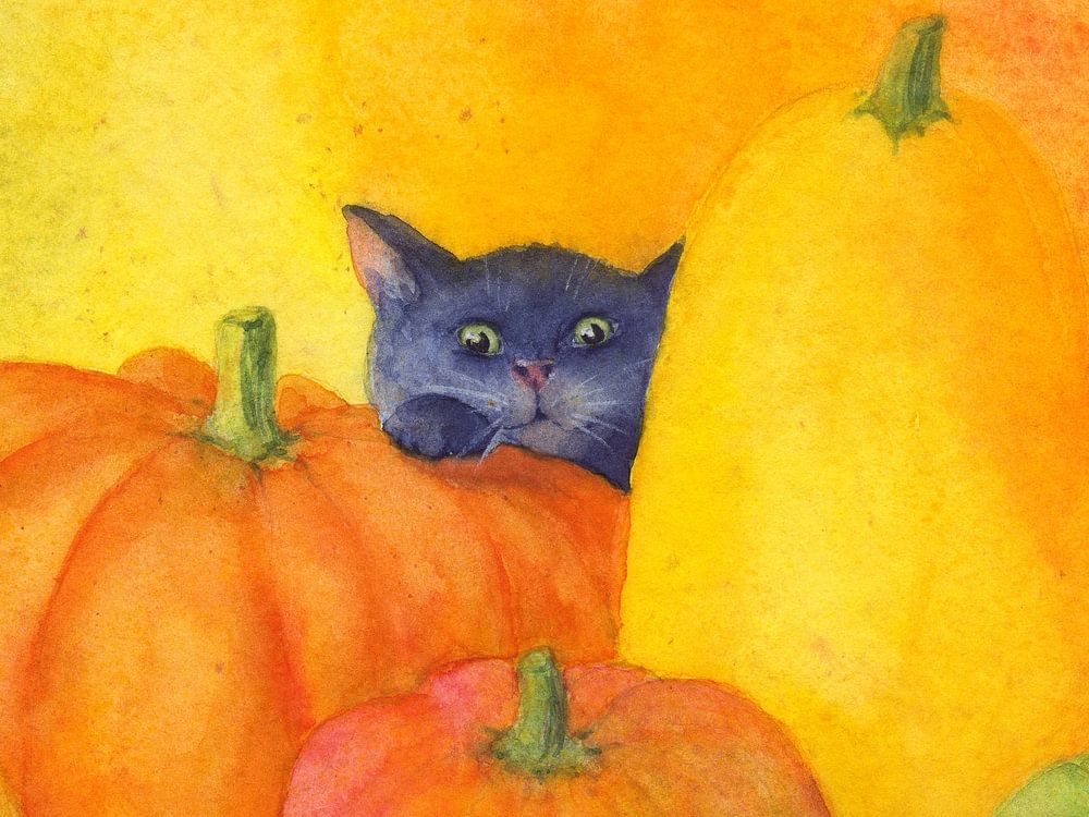 Schwarze Katze lugt hinter Kürbissen hervor ist ein handgemaltes Aquarellgemälde der Künstlerin Karen Kaspar. Es ist hervorragend geeignet für die herbstliche Dekoration des Hauses und für alle, die an Halloween eher auf süße als auf schaurige Bilder stehen. Somit auch ein wunderschöner farbiger Akzent für Kinderzimmer oder für die herbstliche Küche oder das Esszimmer.