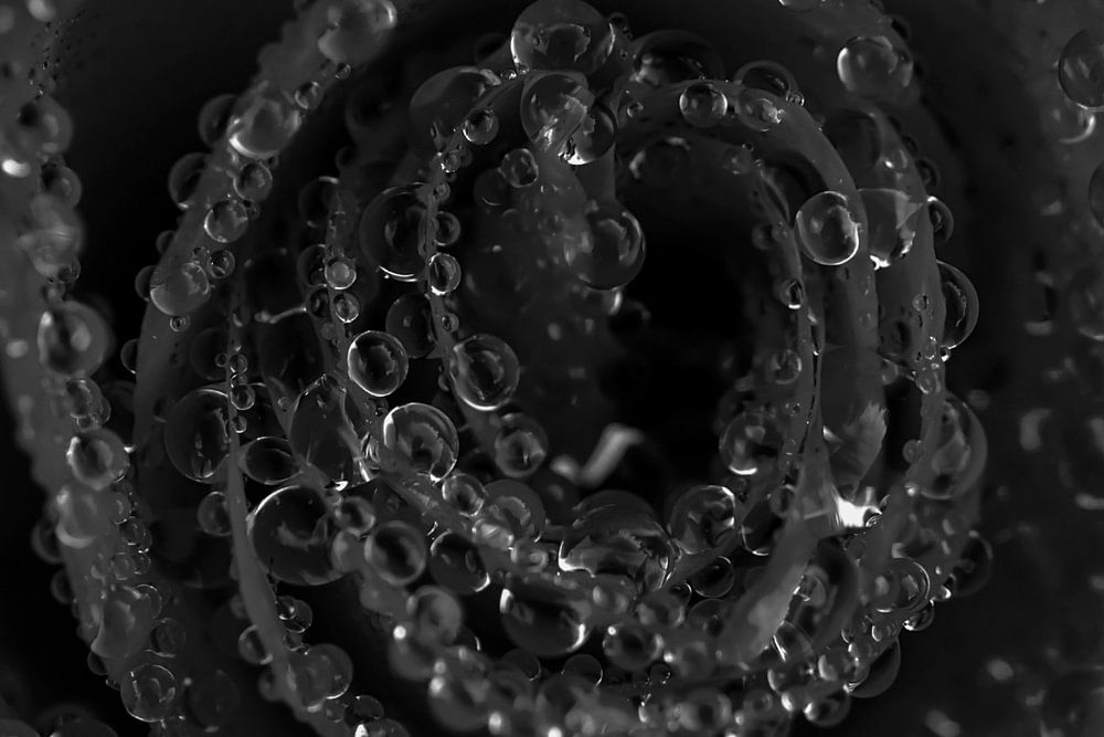 Detailliertes, stimmungsvolles Bild einer Rose mit Tautropfen, fotografiert am frühen Morgen und in schwarz-weißer Farbpalette. Passt in jedes Zimmer.