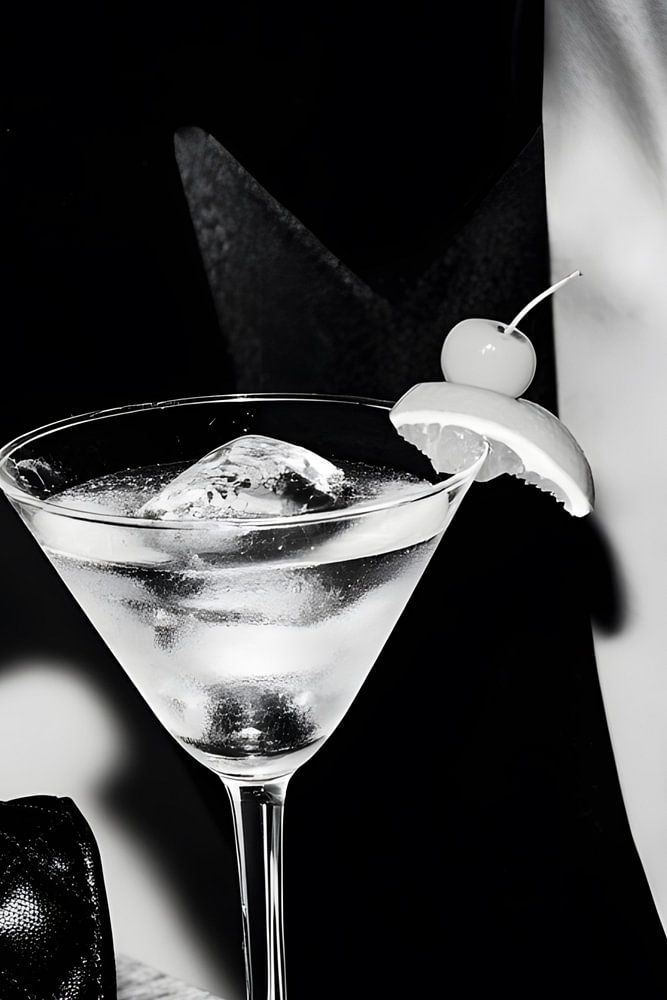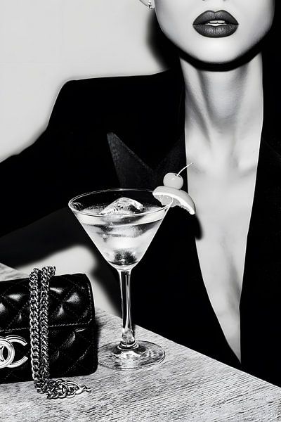 Die Schwarzweißaufnahme zeigt eine elegante Szene an einem Tisch: Im Vordergrund steht ein klassisches Martini-Glas mit Eis, Zitruszeste und Kirsche. Daneben liegt eine luxuriöse Handtasche mit Kettenriemen. Im Hintergrund ist der Oberkörper einer stilvoll gekleideten Frau zu sehen – der Fokus liegt auf Hals, Lippen und Dekolleté. Das…