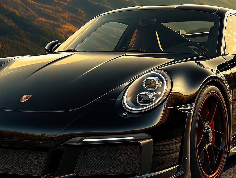 Ein imposanter schwarzer Porsche kontrastiert mit den herbstlichen Farben der bergigen Umgebung. Die schneebedeckten Berggipfel bilden eine majestätische Kulisse, während der Sportwagen die Kraft und Eleganz der Natur widerspiegelt. Ein Zusammenspiel von Kraft, Geschwindigkeit und stiller Schönheit inmitten atemberaubender Landschaften.