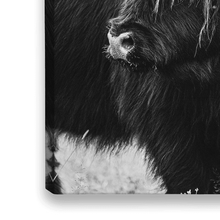 Ein Schwarz-Weiß-Porträt eines schwarzen schottischen Highlanders. Dieses Porträt wurde auf einer Wiese in Österreich aufgenommen. Holen Sie sich den majestätischen schottischen Hochlandrind mit diesem schönen Schwarz-Weiß-Fotodruck in Ihr Zuhause - ein rauer, aber schöner Anblick. Der schottische Highlander ist eine ikonische Kuh, die…