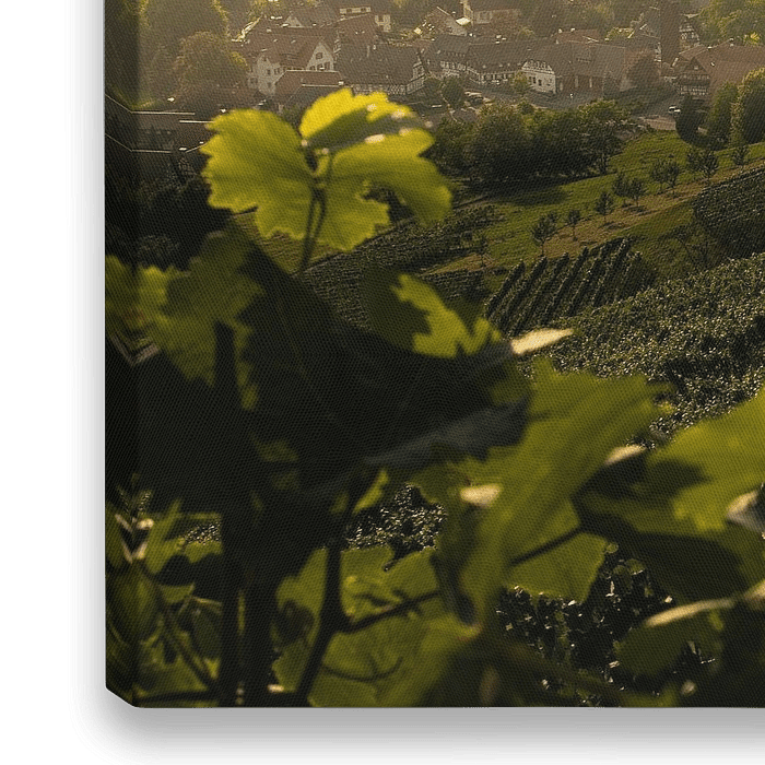 Blick über einen Weinberg bei Sonnenuntergang in der goldenen Stunde.