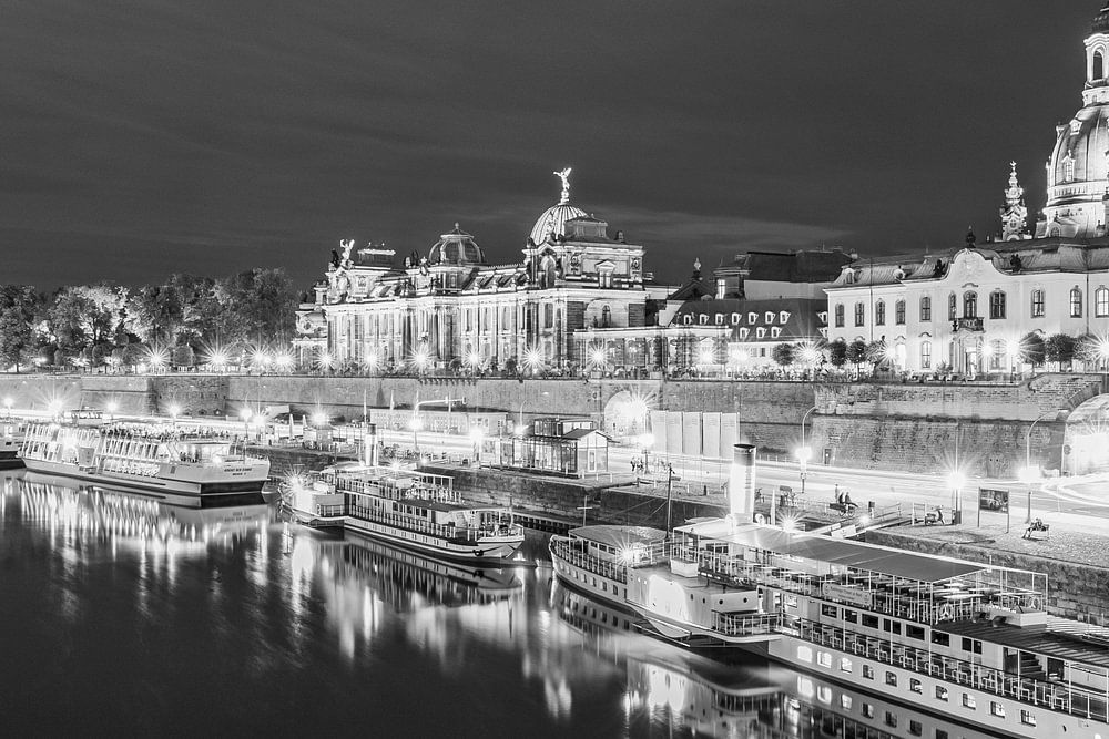 Schwarzweißaufnahme Stadtansicht mit Ausflugsdampfer vor der Brühlschen Terrasse auf der Elbe, der Kunstakademie und der Frauenkirche, Dresden, Sachsen, Deutschland.