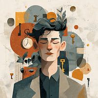 Ein digitales Kunstporträt mit schwebenden Schlüsseln und Uhren, dargestellt im modernen, flachen Illustrationsstil. Kräftige, flache Farben, eine weiche Vintage-Körnung, klare Vektorformen und minimale Schattierungen verbinden sich mit einer warmen, erdigen Farbpalette zu einer poetischen, surrealistischen Stimmung. Eine ruhige,…