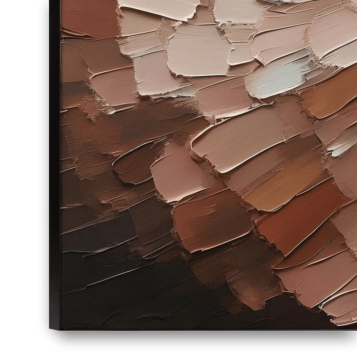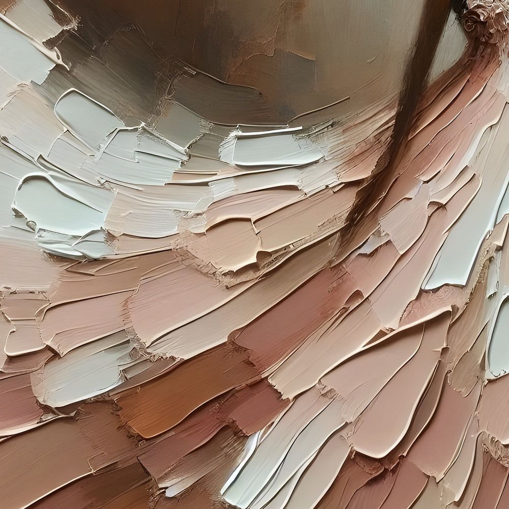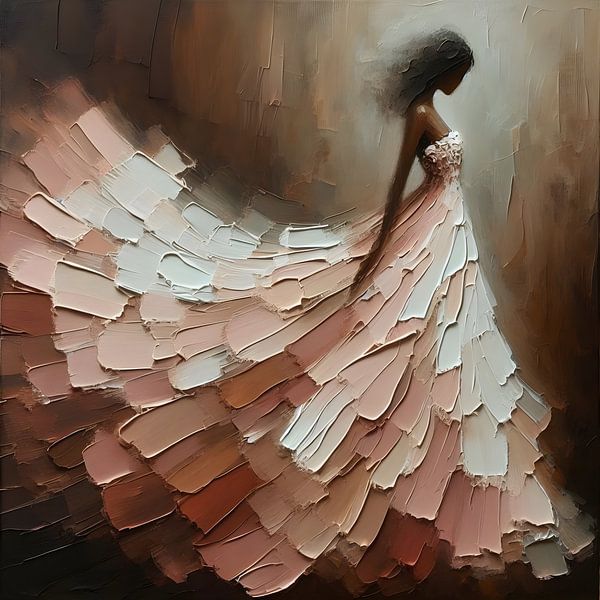 Abstraktes Ölgemälde, ausdrucksstarke Pinselstriche und dicke Farbtextur (Impasto), Erdtöne wie Ocker, Siena und warmes Braun. Eine weibliche Figur im Zentrum des Bildes, teilweise abstrakt wiedergegeben, gekleidet in ein langes blassrosa Kleid, das subtil mit dem erdigen Hintergrund kontrastiert. Minimalistische Formen, emotionale…