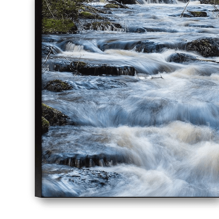 Fließendes Wasser aus einem Bach in der schwedischen Landschaft in der Provinz Småland, Kalmar län es sind die ersten Tage des Winters.