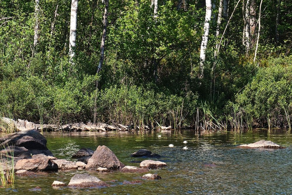 Ein Bild der schwedischen Landschaft in Frühlingsfarben mit einer Aura, die als heiter beschrieben werden kann. Es vermittelt dem Betrachter eine heitere Stimmung. Ob es nun eine Aussicht, fließendes Wasser oder eine Seerose ist, es ist ein heiteres Bild.