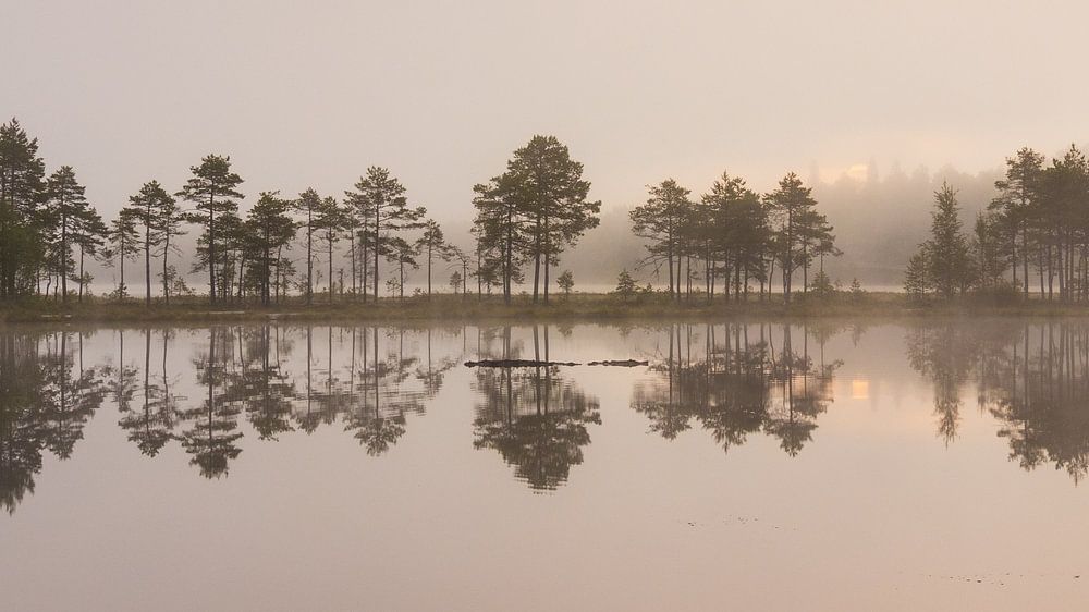 Schweden, das Land der Bäume und Seen. Und auch der Ruhe und der Natur. An diesem frühen, nebligen Morgen an einem See in der Nähe von Fredriksberg, Mittelschweden, ist es ein wunderbar entspannender Weckruf. Wir genießen die Natur, die Stille und die kleine Welt. Die aufgehende Sonne versucht, durch den Nebel zu brechen, während sich die Bäume im ruhigen Wasser spiegeln und eine Symmetrie schaffen.