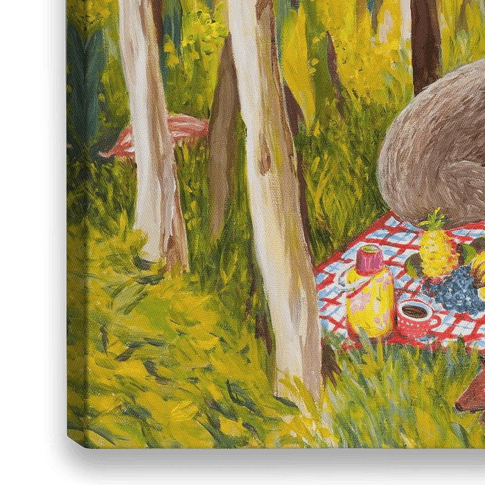 Wild - Schweine sitzen im Wald auf der reich gedeckten Picknickdecke und prosten sich zu, auf dem Ast darüber ein Eulenpäärchen, Frischlinge laufen drum rum