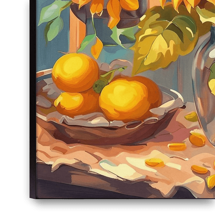 Das Gemälde ist überschwemmt von leuchtenden Farben, von den warmen Ockertönen und den sonnenverwöhnten Gelbtönen der Blütenblätter der Sonnenblume bis hin zu…