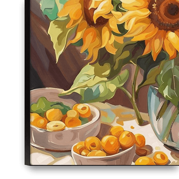 Das Gemälde ist überschwemmt von leuchtenden Farben, von den warmen Ockertönen und den sonnenverwöhnten Gelbtönen der Blütenblätter der Sonnenblume bis hin zu…