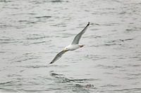 Eine schwimmende Möwe, die anmutig knapp über dem Wasser fliegt.