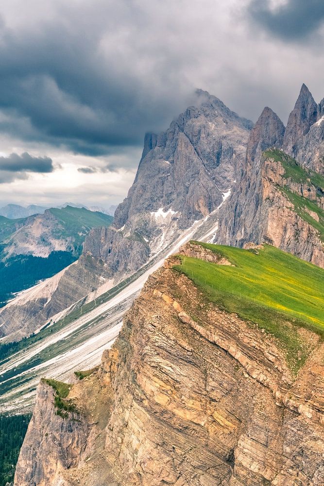 Die dramatischen Felsen des Seceda-Gebirges in den Dolomiten an einem bewölkten Tag mit Blick auf die Geislergruppe. Der Seceda-Gipfel in den Dolomiten, Südtirol (Alto Adige), Italien ist ein beliebtes Ausflugsziel für Touristen und mit der Seceda-Seilbahn von Urtijëi aus erreichbar.