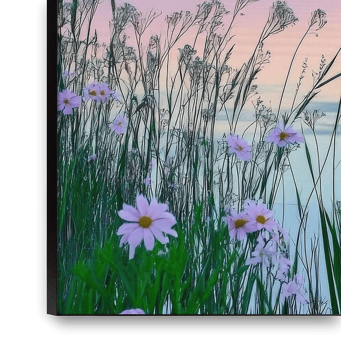 Sanfte Pastelltöne verschmelzen am Horizont mit dem ruhigen Wasser, während zarte Wildblumen fröhlich im Wind wiegen. Die stillen Wellen spiegeln die Farben des Himmels wider und laden zur Ruhe ein. Schilfrohr bietet einen harmonischen Rahmen und verstärkt das Gefühl von natürlicher Idylle an diesem friedlichen Ort.