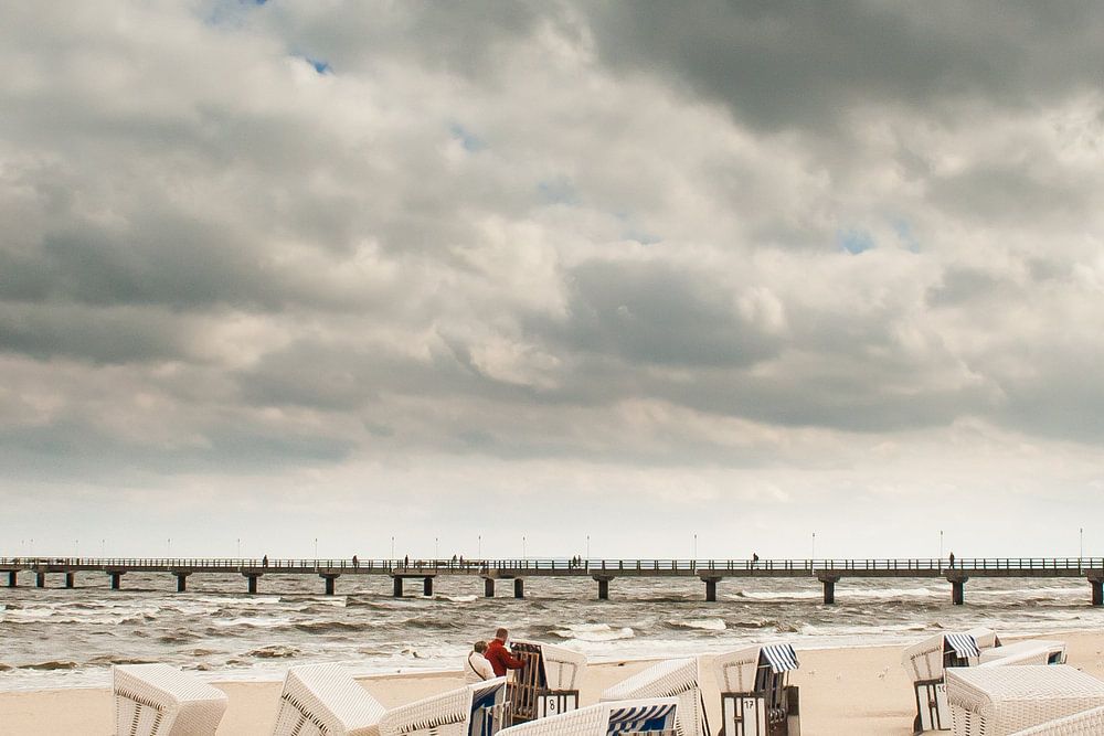 Blick auf den Strand bei Ahlbeck mit der Seebrücke im Hintergrund.