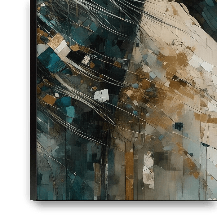 Eine digitale Darstellung eines Pferdekopfes verbindet abstrakte geometrische Formen mit realistischeren Details. Braun-, Gold- und Teetöne werden verwendet, um einen dynamischen und fragmentierten Effekt zu erzeugen, der dem Werk ein Gefühl von Bewegung verleiht.