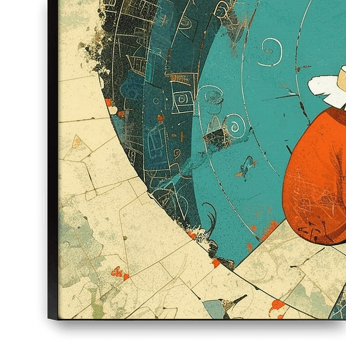Water Lily Art | Orbital Fishbowl - Dieses lebhafte Gemälde zeigt einen Mann in orangefarbener Kleidung und einem großen Hut, der am Rande eines kreisförmigen Gewässers sitzt, in dem verschiedenfarbige Koi-Fische vor einem Hintergrund aus abstrahierten Bögen und Symbolen schwimmen.