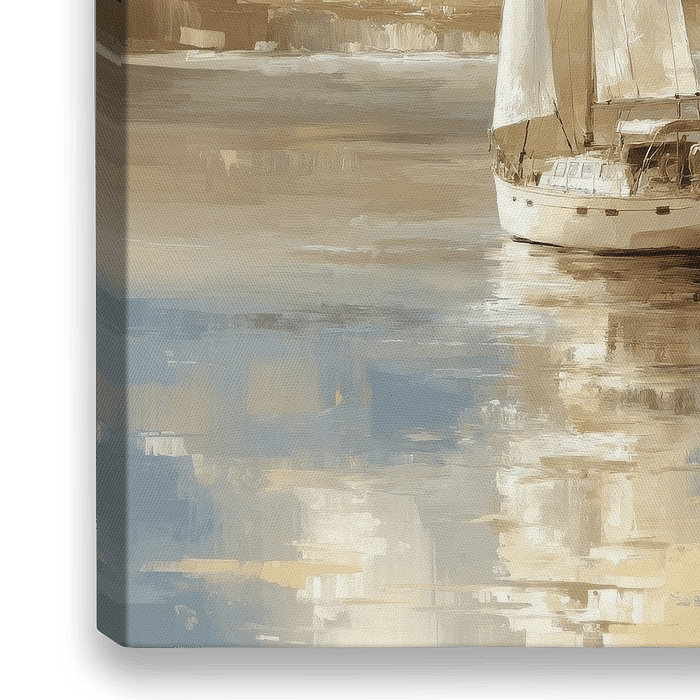 Ein stimmungsvolles Ölgemälde zeigt ein Segelboot auf ruhigem Meer, umgeben von sanften Klippen im Hintergrund. Die harmonische Farbpalette aus Beige und Hellblau, detaillierte Pinselstriche und neutrale Farbtöne erzeugen eine friedliche, entspannte Atmosphäre. Das weiche Licht und die Spiegelung auf der Wasseroberfläche verleihen der…