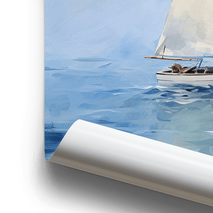 Segeln - Das Gemälde zeigt eine ruhige Szene eines Segelboots, das über die blaue Wasseroberfläche gleitet, wobei die Bewegung durch die Pinselstriche betont wird. Die verschiedenen Blautöne im Hintergrund suggerieren einen offenen Himmel und schaffen ein Gefühl der Ruhe. Die Komposition hält das Segelboot schön in der Mitte und lässt Raum für die Reflexion des Wassers.