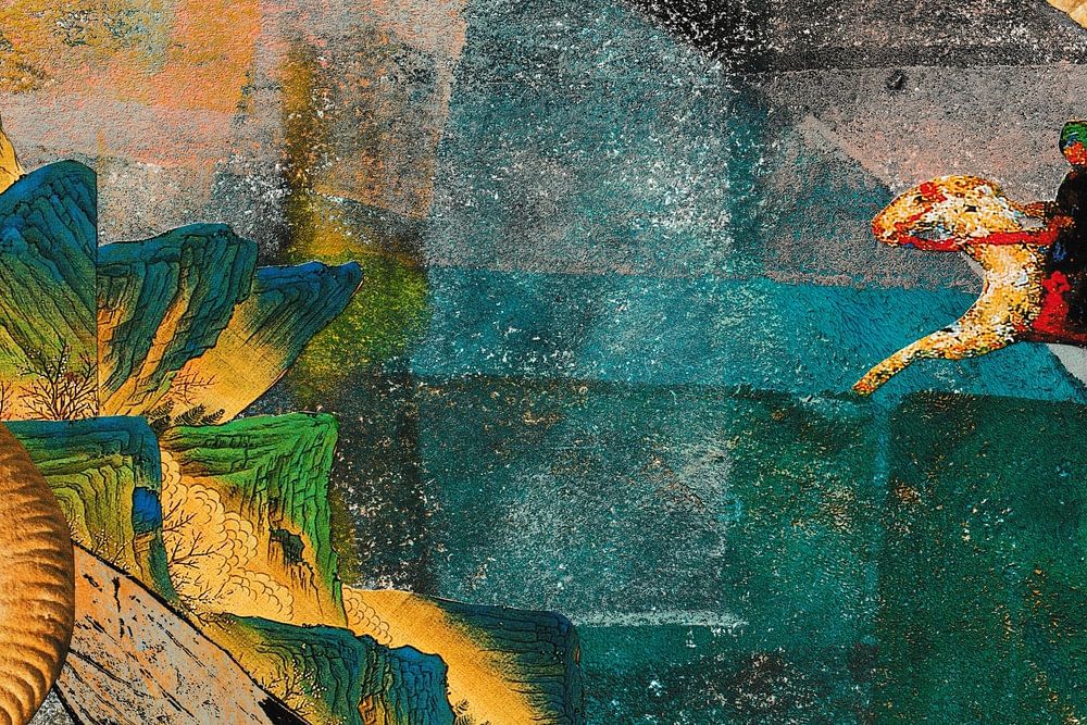Ein breites, halbkreisförmiges Band in Petrolblau verläuft von rechts unten nach links oben. Dieses wird von einem horizontalen ockergelben Band durchschnitten, über das ein Reiter von rechts nach links eilt. Der Raum darüber ist dunkelgrau und verjüngt sich zu einem pastellfarbenen Lachsrosa.