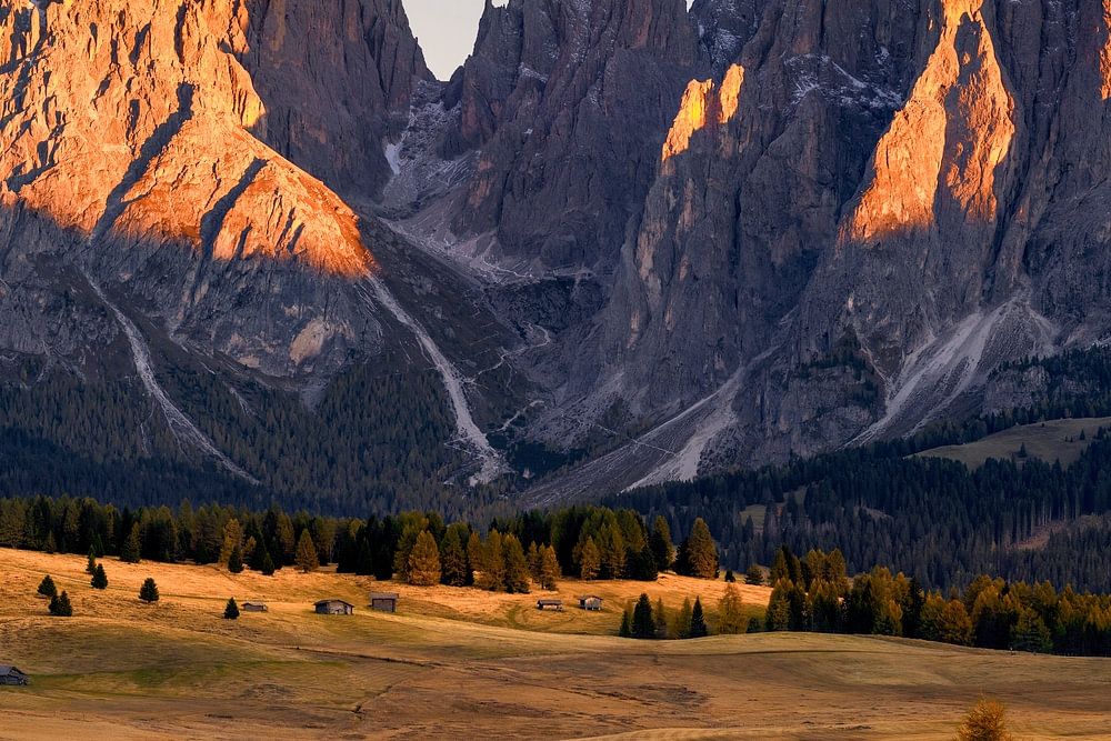 Goldener Herbst auf der Seiser Alm in Südtirol in den Dolomiten mit warmen braunen und sandfarbenen Erdtönen / Erdfarben. Berglandschaft
