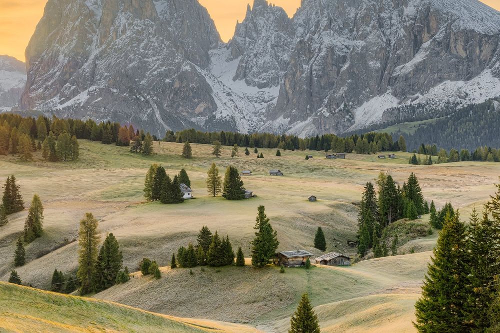 Sonnenaufgang auf der Seiser Alm an einem kalten Morgen im Herbst.