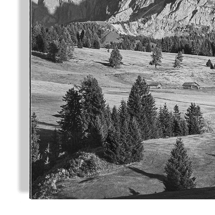 Ein Schwarz-Weiß-Foto der Seiser Alm, einer Hochebene der Dolomiten und der größten Hochalm Europas.
