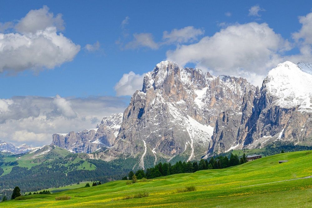 Seiser Alm oder Alpe di Siusi - mit Langkofel im Hintergrund im Frühling in den Dolomiten. Gelbe Frühlingsblumen auf den Wiesen und einige Holzhütten auf der Hochebene in den Alpen, Trentino Alto Adige, Südtirol, Italien.