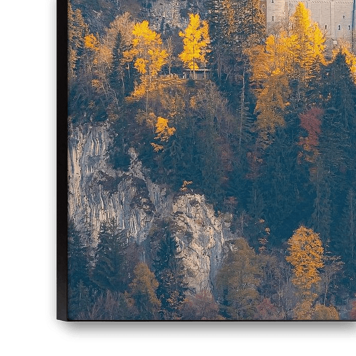 Das weltberühmte Märchenschloss thront hoch über den bewaldeten Hügeln bei Füssen, umgeben von Bäumen in leuchtenden Herbstfarben.