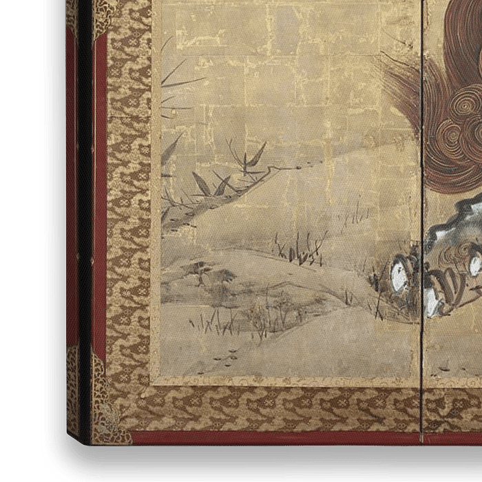 Die Verwendung von Goldfolie als Hintergrund für die herumtollenden Tiere war sowohl eine praktische als auch eine dekorative Funktion. Da die traditionellen japanischen Räume keine Fenster hatten, kam die Innenbeleuchtung von tragbaren Öllampen und Kerzen, deren Wirkung durch reflektierende Oberflächen verstärkt wurde.