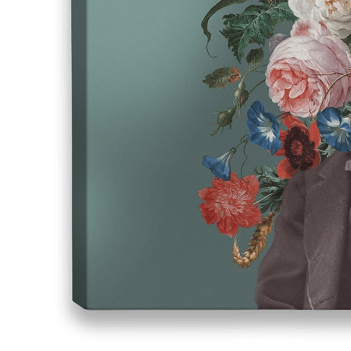 Alte Porträtfotos, aus denen die Gesichter geschnitten sind, faszinieren mich enorm. Ich fülle diese Löcher aus. In diesem Fall mit Elementen aus 'Stillleben mit Blumen in einer Glasvase, Jan Davidsz. de Heem, 1650 - 1683 '