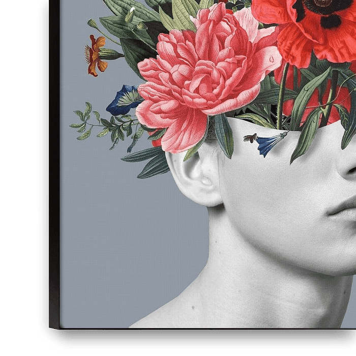 Bestelle dieses Blumen-Wandbild Selbstbildnis mit Blumen 5 (blau-grau stehend) von toon joosen als Reproduktion auf Leinwand, Alu-Dibond, als Poster, Fototapete oder Acrylglasbild.