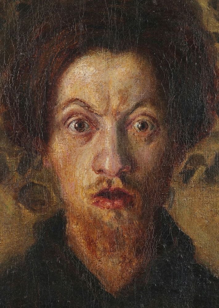 Erschrocken blickt der Maler auf sein Porträt, das von Totenköpfen in einer dunklen und schwarzen Umgebung umgeben ist.