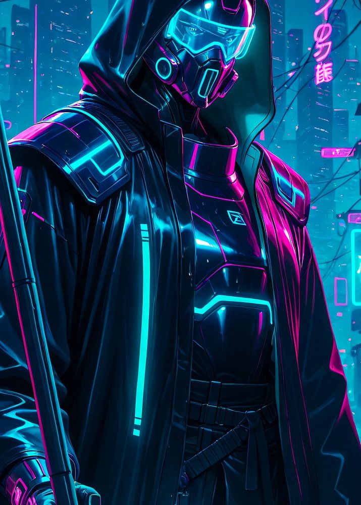 In den neongetränkten Gassen der Cyberpunk-Zone wandelt der Neon Reaper in aller Stille. In Obsidian gehüllt und mit glühenden Schaltkreisen versehen, ist seine Anwesenheit sowohl eine Warnung als auch ein Versprechen. Die Sense, die er bei sich trägt, surrt mit blauem Plasma, ihre Schneide ist scharf genug, um Fleisch, Stahl oder Daten gleichermaßen zu durchtrennen. Seine Maske reflektiert das endlose Glühen der Stadt und verbirgt die Augen eines Menschen, der nicht mehr ganz menschlich ist - oder es vielleicht nie war. Er ist weder Attentäter noch Selbstjustizler, sondern etwas Älteres, Zeitloses: die Verkörperung der Unausweichlichkeit. Wenn man ihm begegnet, weiß man, dass das Ende bereits geschrieben worden ist.