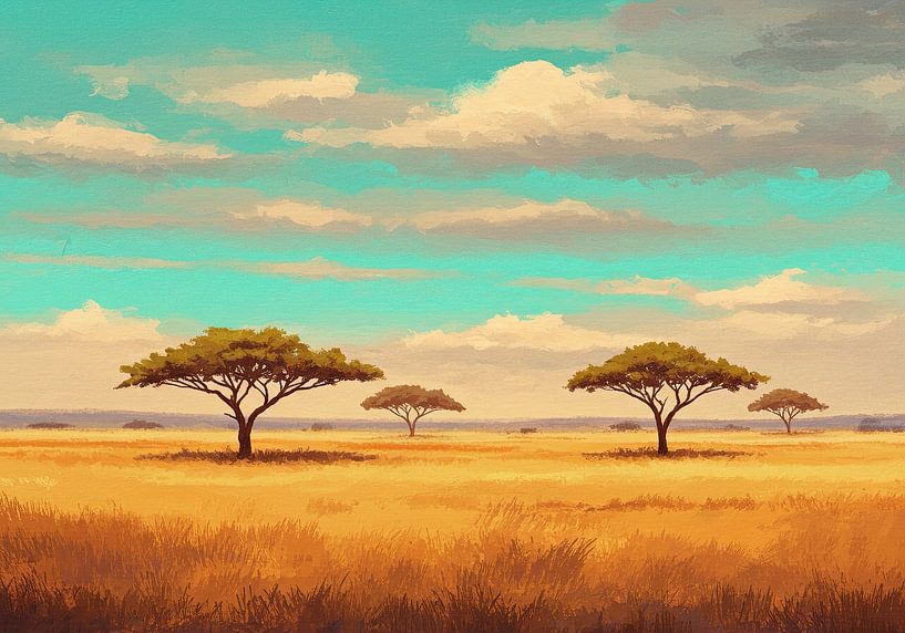 Ein lebhaftes, stilisiertes Gemälde einer afrikanischen Savannenlandschaft. Der Vordergrund ist ein Meer aus goldenem Gras, das mit den charakteristischen Silhouetten von Akazienbäumen übersät ist. Darüber erstreckt sich ein türkisfarbener Himmel mit breiten, malerischen Wolken, die einen auffälligen Kontrast bilden und ein Gefühl von…