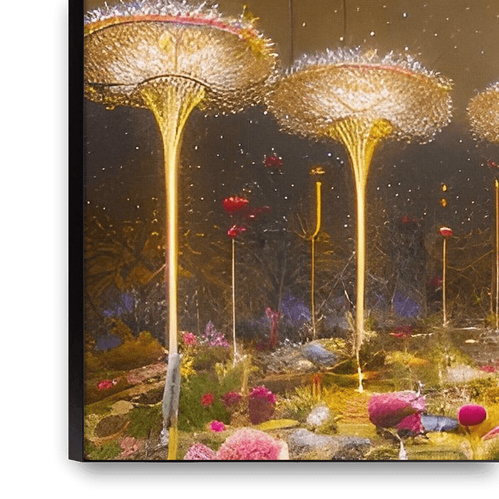 Bestelle dieses Landschafts-Wandbild Serie: Surrealistische Landschaft mit vielen Blumen -3 von Carina Dumais als Reproduktion auf Leinwand, Alu-Dibond, als Poster, Fototapete oder Acrylglasbild.