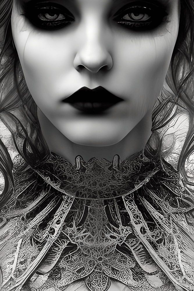 Diese Frau hat einen Gothic-Look, denn sie hat dicke, sichtbare schwarze Linien um die Augen, schwarzen Lippenstift und dicht gesetzte schwarze Augenbrauen.