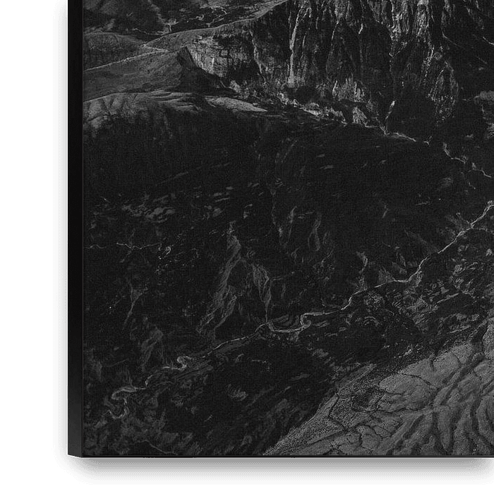 Vom Himmel aus entfaltet sich eine zerklüftete Landschaft aus Bergen, Schluchten und Flüssen, die in ein Spiel aus Licht und Schatten gehüllt ist. Dieses Schwarz-Weiß-Bild hebt die dramatischen Kontraste der Natur hervor: die harten Felsformationen im Gegensatz zu den weichen, mäandernden…