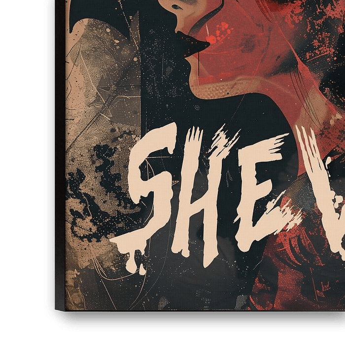 Ein abstraktes Gemälde, das einen weiblichen Teufel darstellt. Das Gemälde ist in dunklen Farben gehalten und hat den Text "SHEVIL" darüber geschrieben.