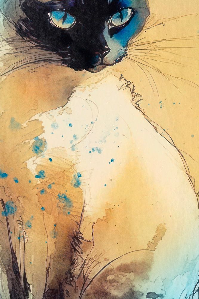 Eine Siamkatze sitzt mit anmutiger Ausstrahlung da, eingefangen in leuchtenden Blau- und sanften Beigetönen. Die ausdrucksstarken Augen und die fließenden Striche vermitteln ein Gefühl von Bewegung und Persönlichkeit. Die Farbmischung verleiht der Komposition eine traumhafte Qualität.
