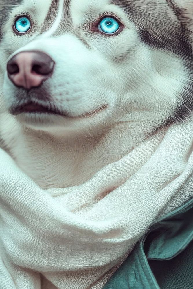 Mit funkelnden, eisblauen Augen, die Neugier und Abenteuerlust ausstrahlen, steht dieser Siberian Husky in einem stilvollen, oversized Mantel und einer weich gewickelten Schal. Sein majestätisches, grau-weißes Fell und die aufmerksame Haltung verleihen ihm einen Hauch von Eleganz und Unerschrockenheit, während er den Betrachter mit einer Mischung aus Charme und Loyalität anblickt.