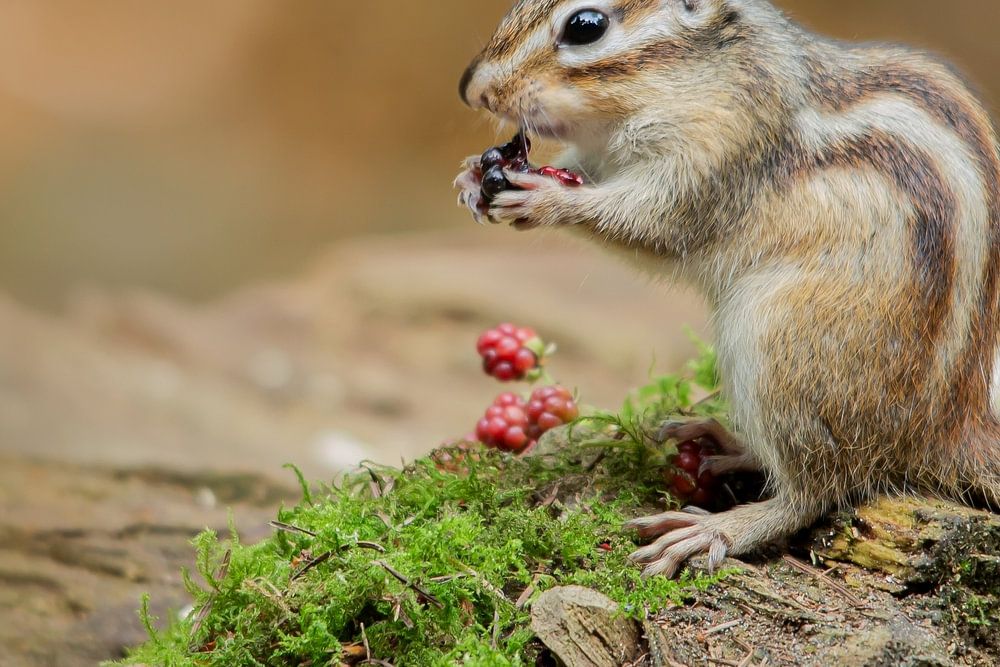 Zwischen dem Sammeln von Nüssen für den Winter erfreut sich dieses sibirische Erdhörnchen an den Brombeeren, die noch im Wald hängen.