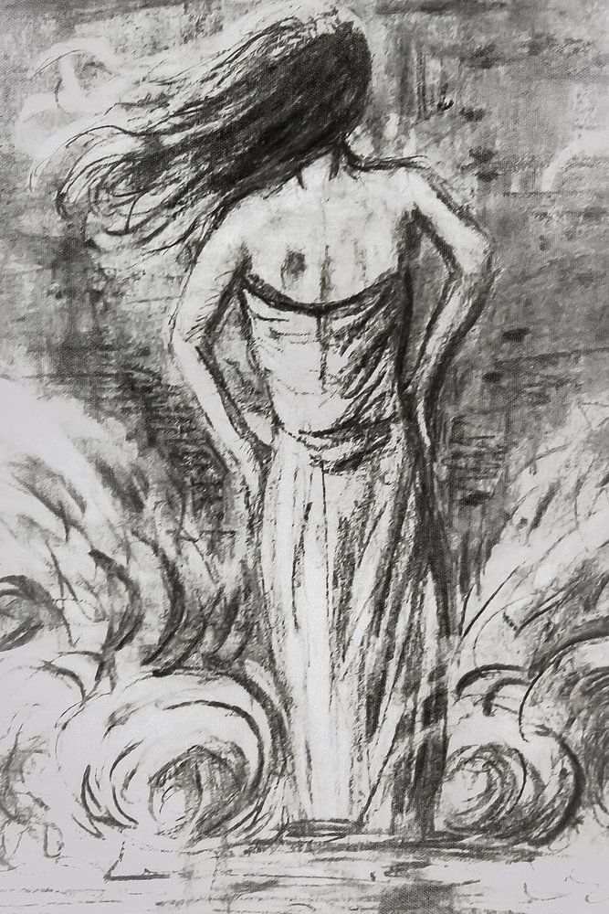 Eine Frau steht in der Brandung, die tosenden Wellen versuchen, sie umzuwerfen, aber sie bleibt standhaft. Dieses Werk symbolisiert Stärke und Standhaftigkeit. Wenn es hart auf hart kommt, kann man entweder das Handtuch werfen oder, wie diese Frau, die Schultern halten und den Schwierigkeiten trotzen.