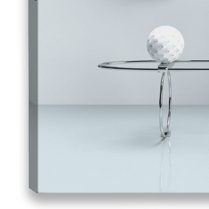 Dreidimensionales abstraktes Design aus silbernen Ringen und texturierten Grundformen in den Farben Gelb und Blau.