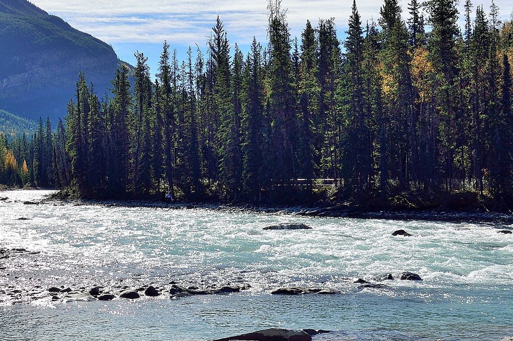 Der Atabasca River entlang des Icefields Parkway in Alberta, Kanada, sorgt für ewige Erinnerungen. Die Farben des Flusses waren im Morgenlicht wirklich wunderschön, da sich das Sonnenlicht im fließenden Wasser spiegelte.